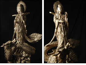 本作は白銀に輝く銀色仕上げの龍上観音菩薩立像です。龍上観音は観音菩薩が龍に乗り、人々を救いに来るお姿です。龍は天に昇るため、古来よりめでたいものとされています。