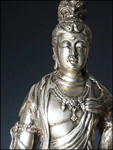 本作は、銅製の観音菩薩像に、銀箔やいぶしを巧みに施し、年代感のある銀色にて仕上げました。
