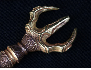 ■先端が三つに別れている金剛杵。加持の法具として使用されることも多く、三鈷杵を持てば、悪神の障難を防ぎ祈願を成就できると経典に説かれています。