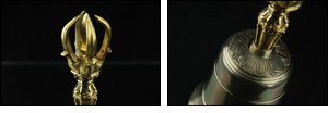■金剛鈴は、もろもろの神仏歓喜させたり、驚覚させるために使われます。一方が鈴で、もう一方が杵の形をした密教法具です。