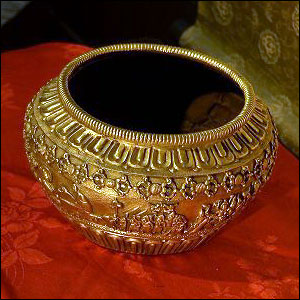 地金となる銅のフラットな艶肌(鉢内面部)に対し、鉢外面部は、全面美しく鮮やかな豪華鍍金仕上げ。蓮弁やバジュラ、ナーガの見事なる円輪、そして、お釈迦さまの誕生から涅槃まで(仏伝)の主要なエピソードが見事に打ち出し彫刻されています。