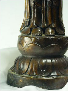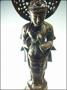 本作は丈夫な黄銅にて作られており、天衣や装飾部分の細部に至るまで、極め細かい見事な彫金が施されています。色合いもよく、銅造の質感が十分に活かされた艶やかな肌。そして、菩薩の慈悲の心を表すかのような穏やかな表情がよく表されており、見る者すべてを心から癒してくれているかのようです。