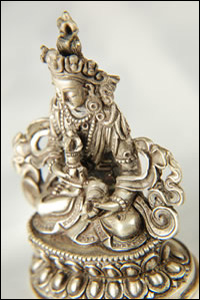 シルバーの高貴な輝きを放つ、穏やかなご面相の普賢菩薩像です。右手に金剛杵(煩悩を打ち破る智を象徴)、左手に金剛鈴(般若の方便を象徴)を持っています。